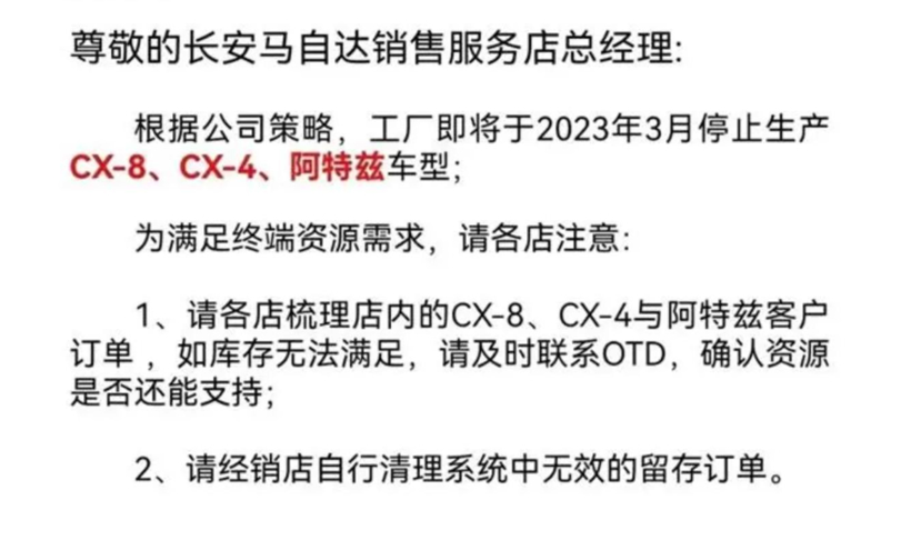 涉及阿特兹/CX-4等车型 马自达宣布将于今年3月停产部分车型日前,我们从相关渠道获取到了马自达内部邮件的相关截图,该邮件显示马自达旗下阿特兹、CX-4、CX-8车型将...