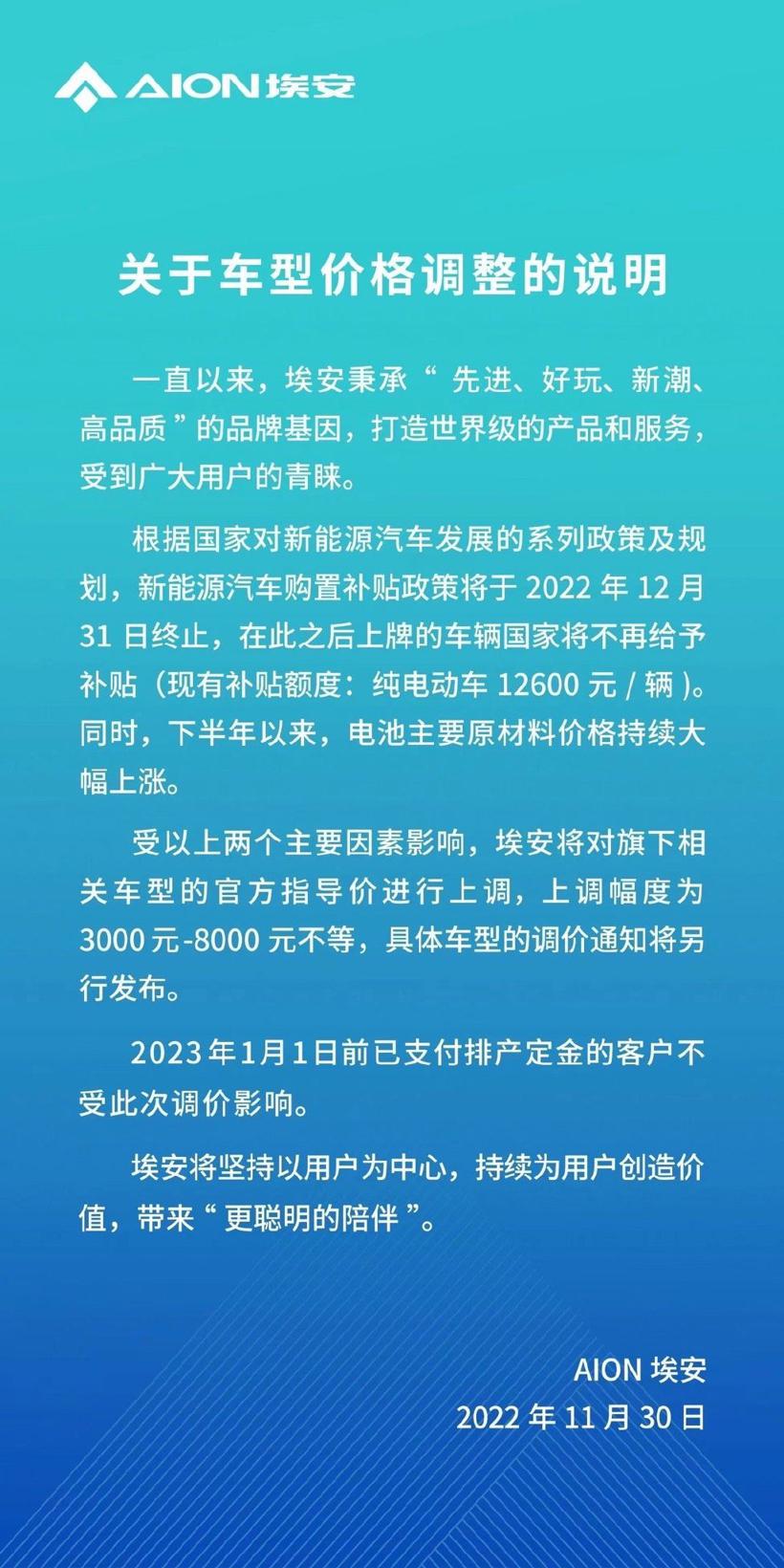 埃安官宣涨价;图片来源:埃安