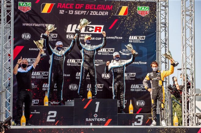 9月12-13日,2020年WTCR房车世界杯新赛季揭幕战在比利时佐尔德赛道正式打响。以全新阵容出战的领克Cyan Racing车队在首场赛事延续了去年首站的出色表现,再次为全球观众上演了一场速度盛宴。最终领克Cyan Racing车队车手扬•埃赫拉舍、伊万•穆勒和圣地亚哥•乌鲁希亚以神勇表现,分别包揽比利时站第二场正赛冠、亚、季军,夺得新赛季开门红。这也是WTCR房车世界杯开办以来首次由同一车队包揽分站正赛前三名。目前领克Cyan Racing车队领跑车手和车队两个积分榜。