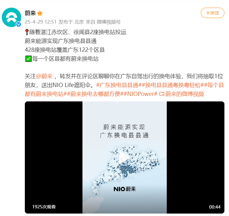 4月29日,蔚来宣布,随着湛江赤坎区、徐闻县2座换电站投运,蔚来能源实现广东换电县县通,428座换电站覆盖广东122个区县。