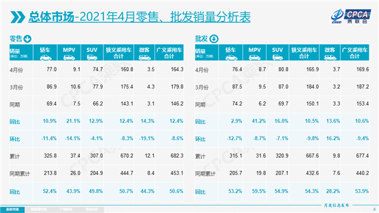 综合1-4月数据来看,国内狭义乘用车累计销售670.2万辆,同比增长50.7%,处于2005年乘联会展开数据统计以来的历史高位。对此,乘联会秘书长崔东树表示,“高增长仍源于去年同期的低基数;同时,新能源车的增长贡献度也不断扩大。”