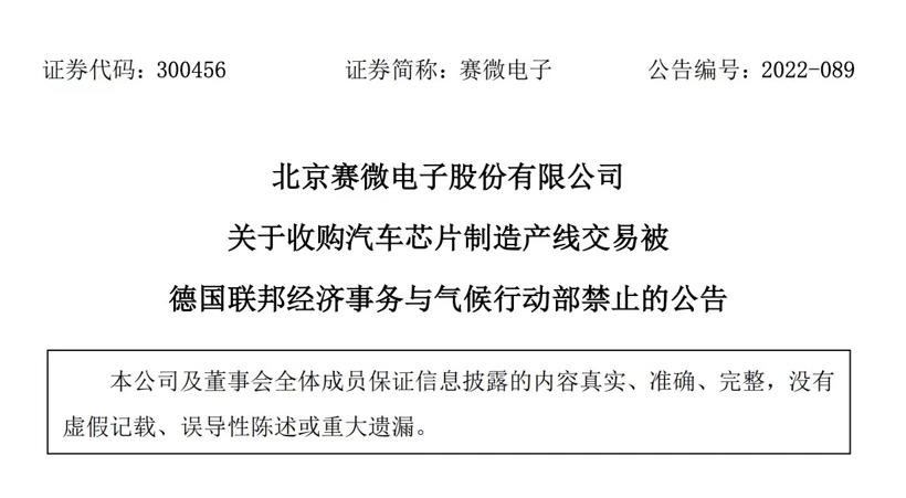 11月10日,赛微电子发布公告称,公司及境内外相关子公司于9日晚收到德国联邦经济事务与气候行动部的正式决定文件,禁止瑞典Silex收购德国FAB5。