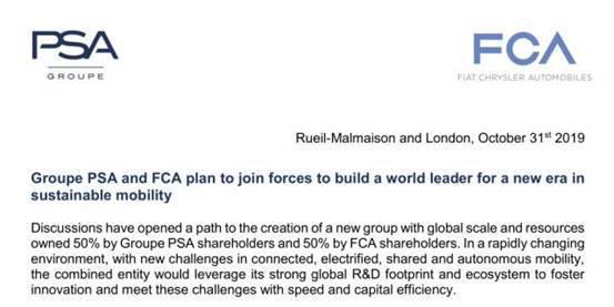 因此,抱团成为一个不错的选择。2019年12月,菲亚特克莱斯勒集团(FCA)和标致雪铁龙集团(PSA)两大汽车集团在正式同意合并,根据双方发布的声明显示,双方已签署一份具有约束力的联合协议,该协议旨在促成两家集团的合并,新的集团双方将各占据50%的股权。