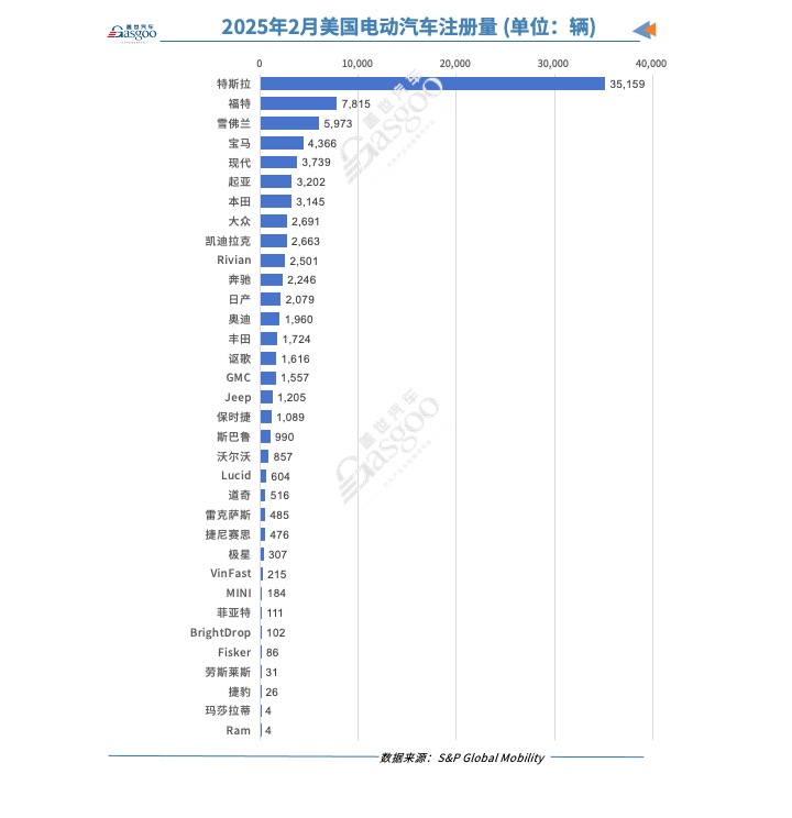 特斯拉在美国纯电动汽车市场的注册量仍居首位,但2月的注册量下降4.2%至35,159辆。数据显示,特斯拉的市场份额降至39.2%,较去年2月下降了7.6个百分点。